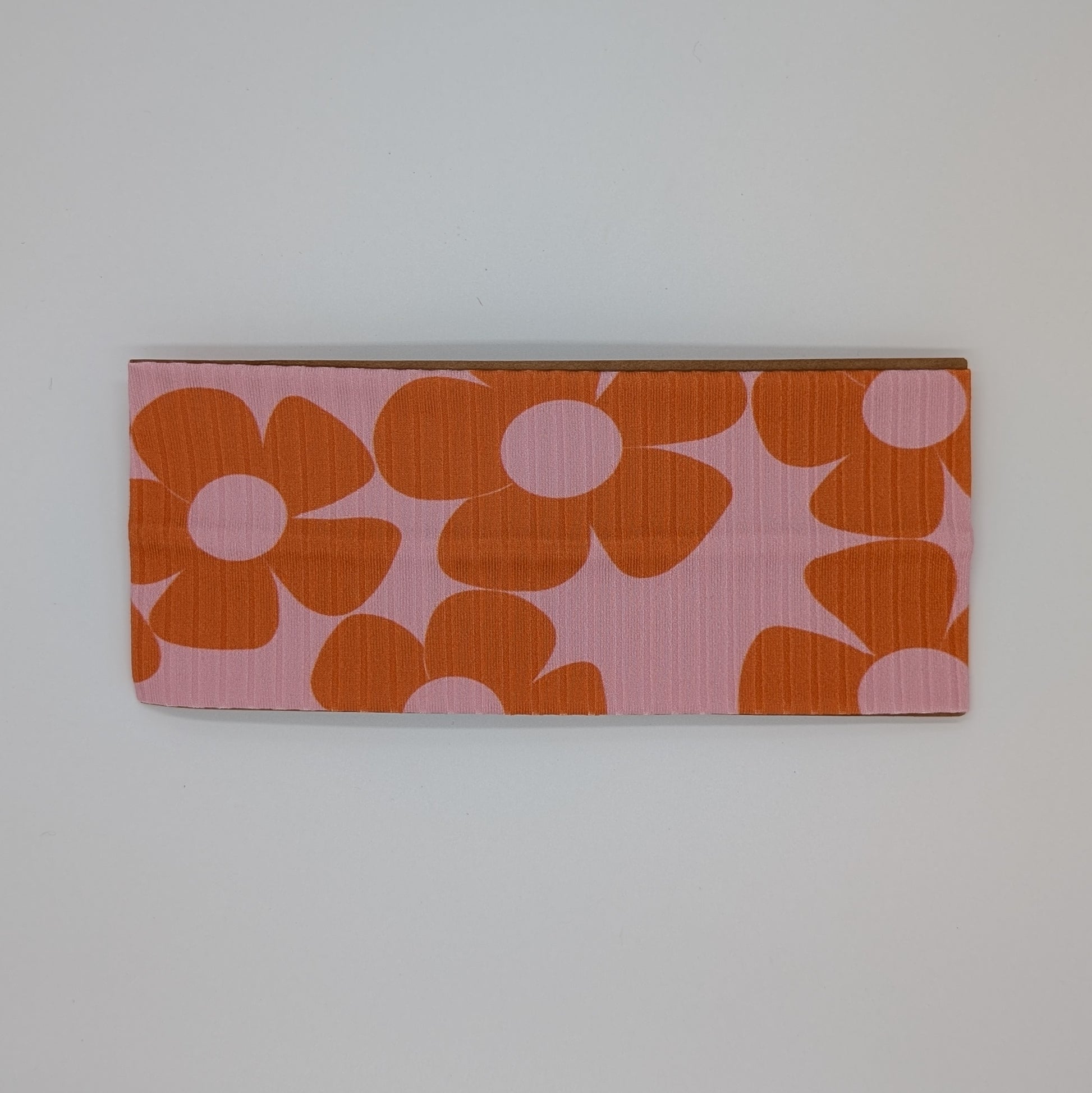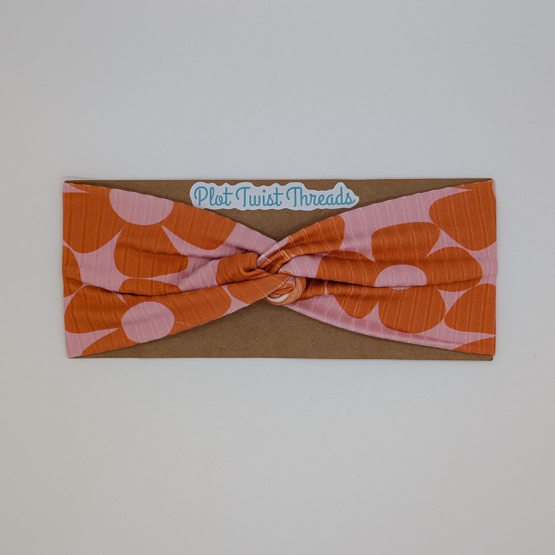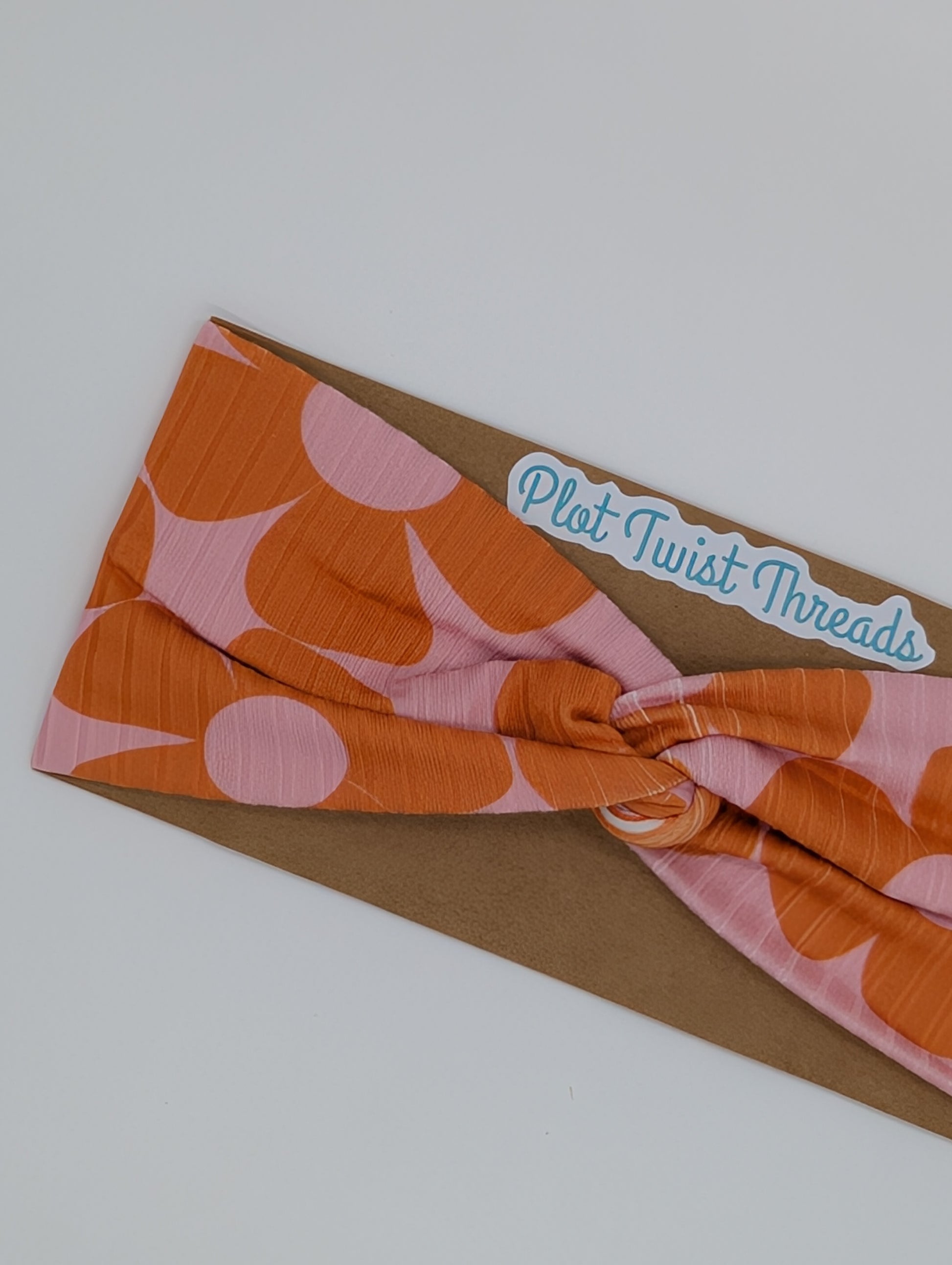 Adult Twist Headband - Rib Knit - Pink With Orange Flowers