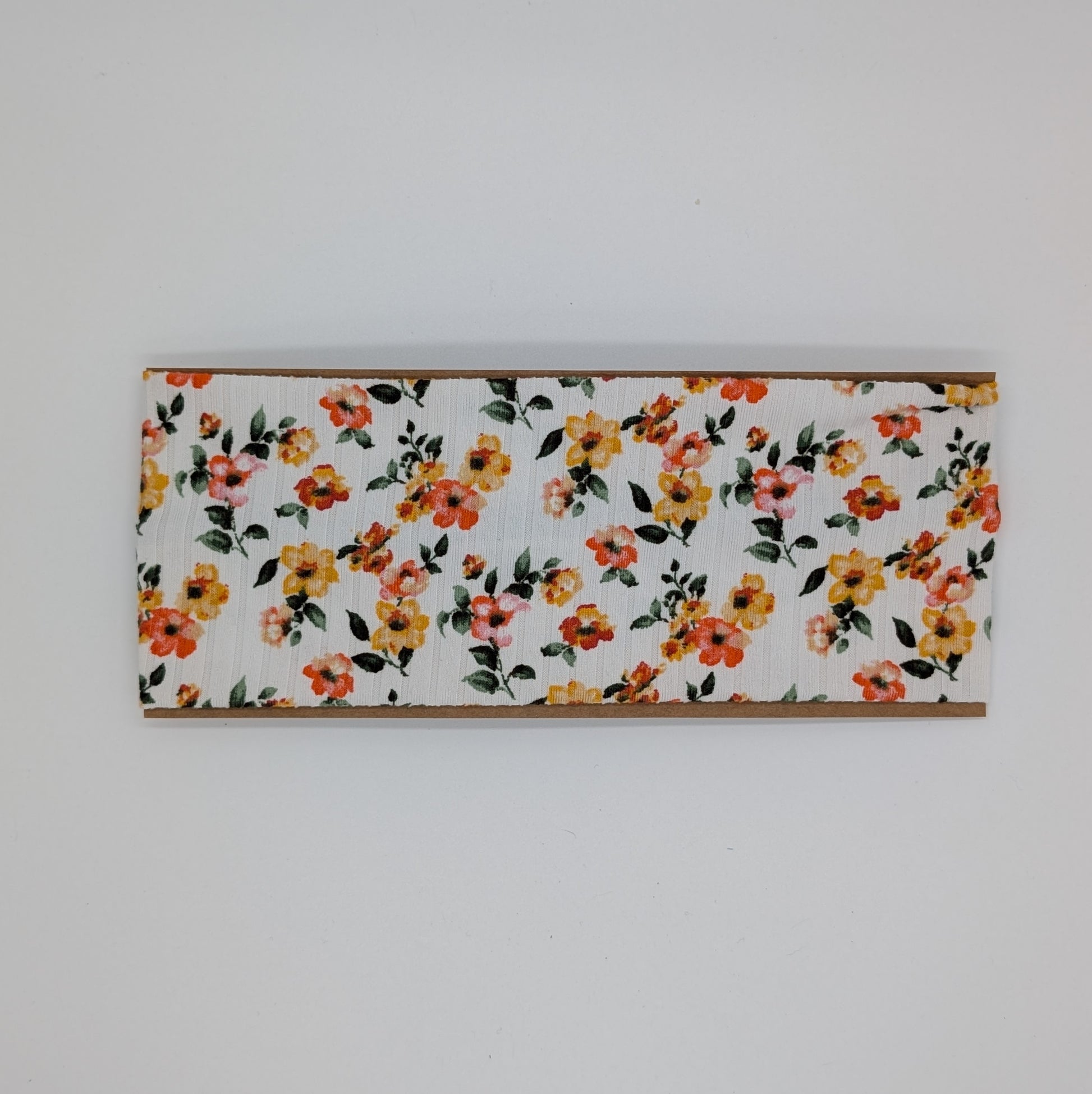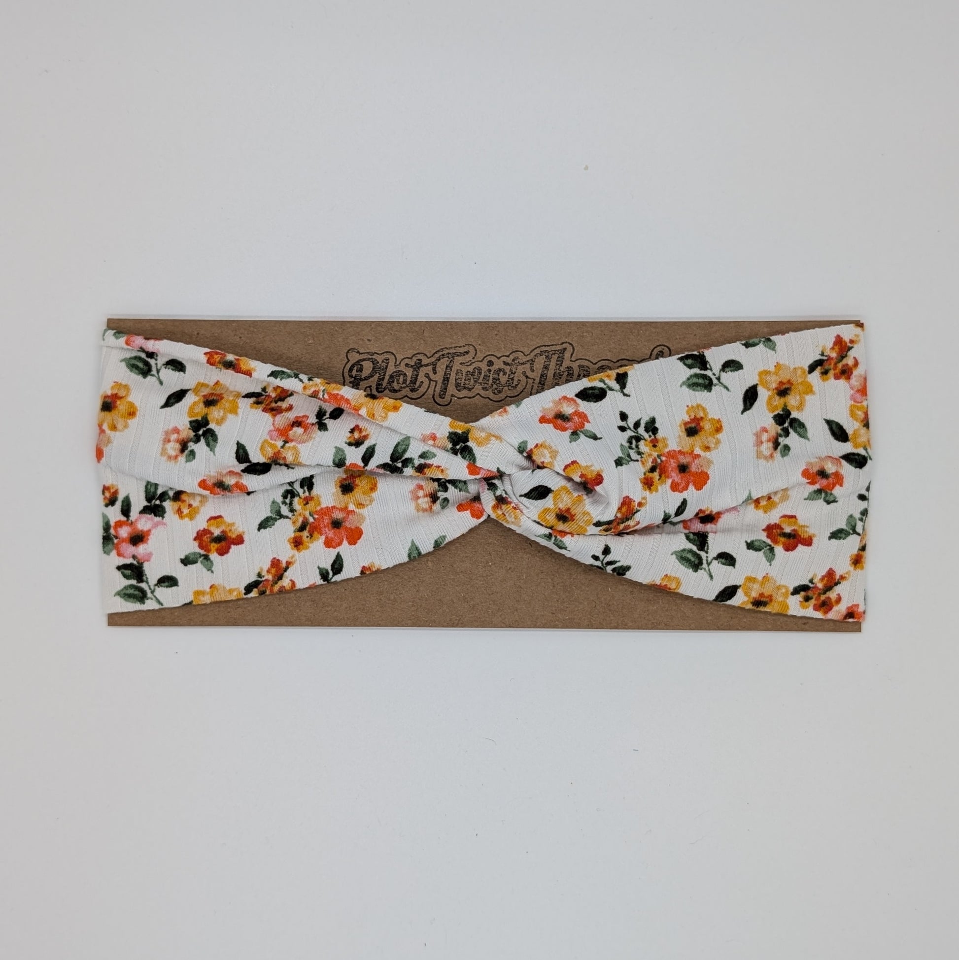 Adult Twist Headband - Rib Knit - White with Orange and Yellow Flowers